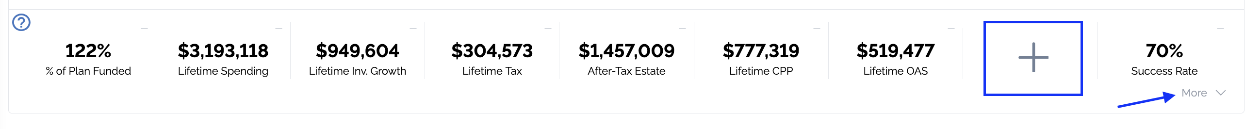 Metrics can be removed by clicking the ' - ' in the top corner of each square. They can be added by clicking the ' + '. You can view additional metrics by selecting 'More' in the bottom right corner of the metric bar.