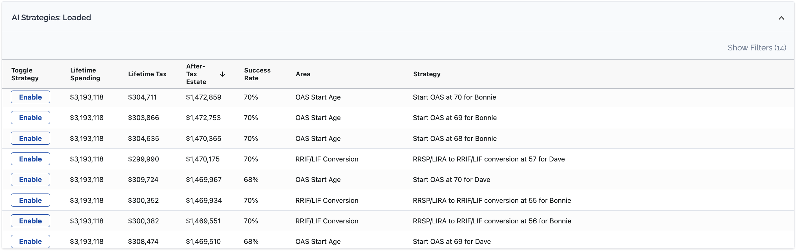 You can enable a strategy by clicking on the 'enable' button. Some strategies do not allow you to toggle on and off, instead you must select another option in that category. For example, you cannot toggle off CPP starting at age 65, but you can select CPP starting at 70 instead.
