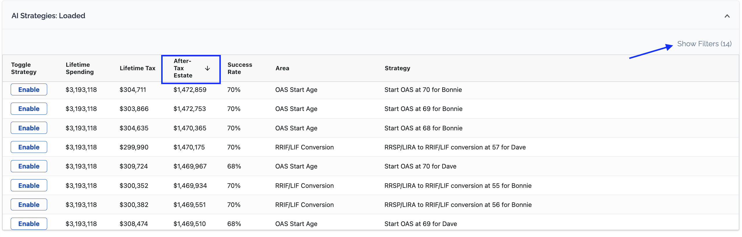 You can sort the recommended strategies by lifetime spending, estate value or success rate. Click the title of each column to select which you would like to use. In the image below we have selected estate value in descending order: