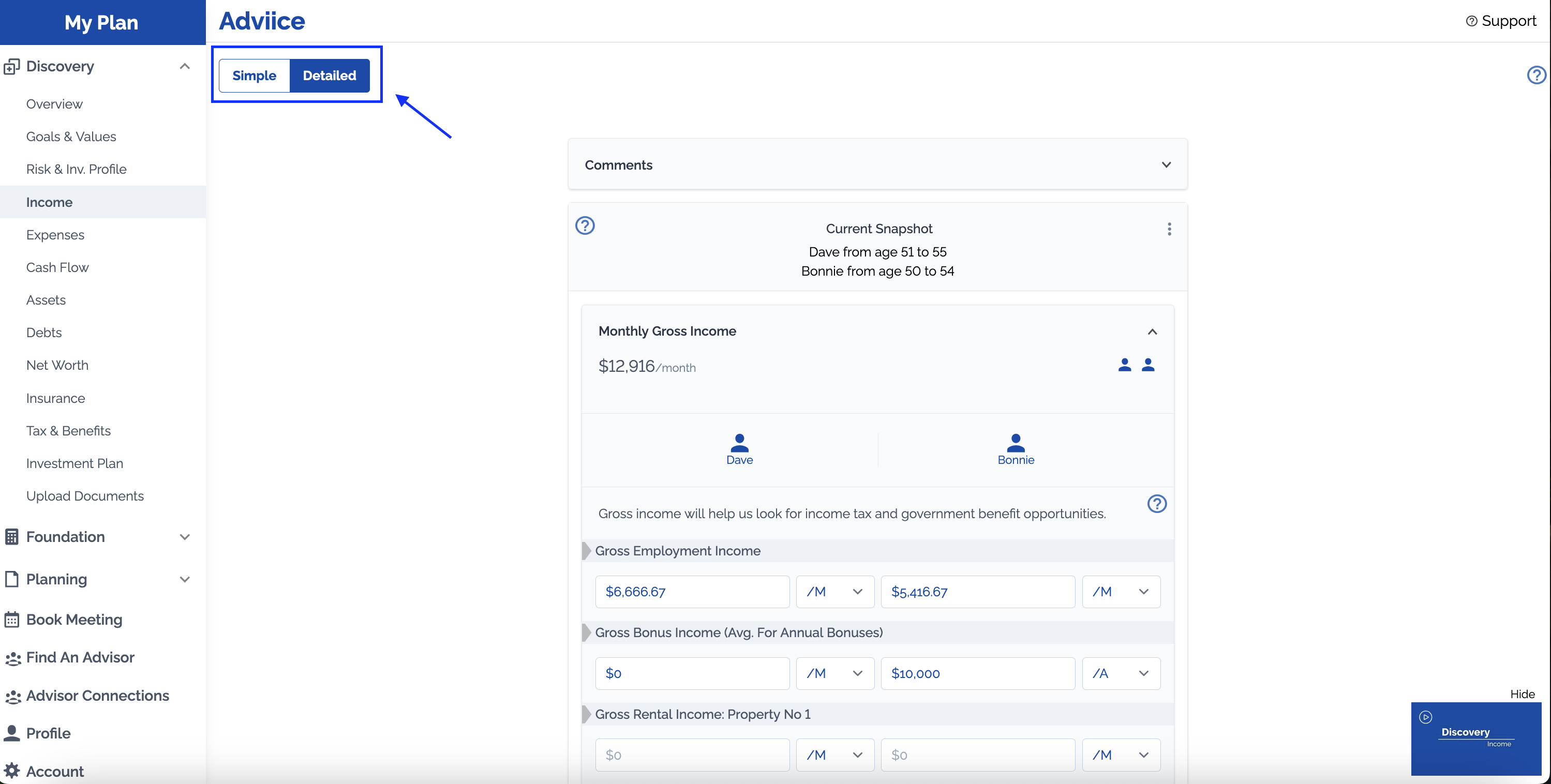 Income information will help us understand your current cash in-flow, but some income sources will be automatically calculated by the platform and others will be entered elsewhere in the Discovery Phase.