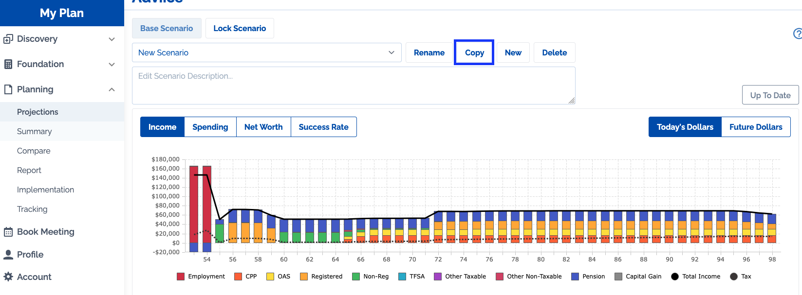 - On the Projections page, start by creating a copy of your current base scenario. You can rename it (e.g., "Base Scenario + Gifts") and add notes to track changes for future reference.