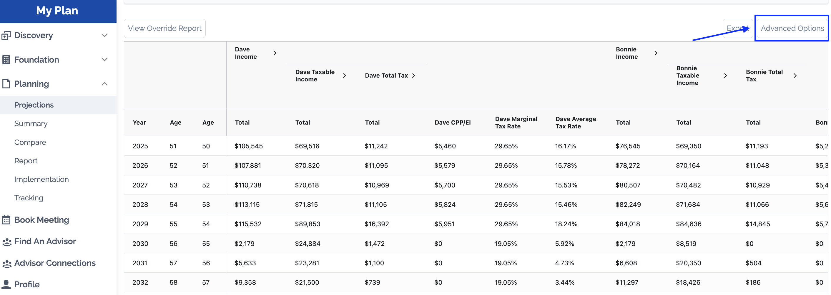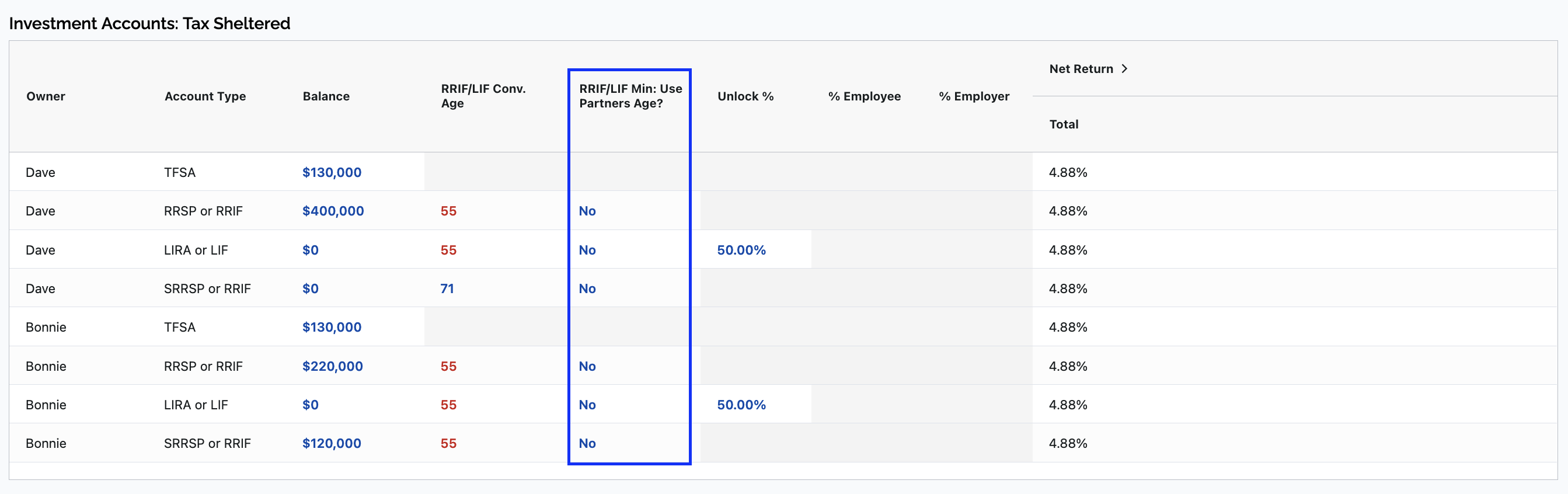 Scroll down to Investment Accounts: Tax Sheltered and you will see a column toggle Yes/No to use a younger spouse's age for minimum withdrawals.