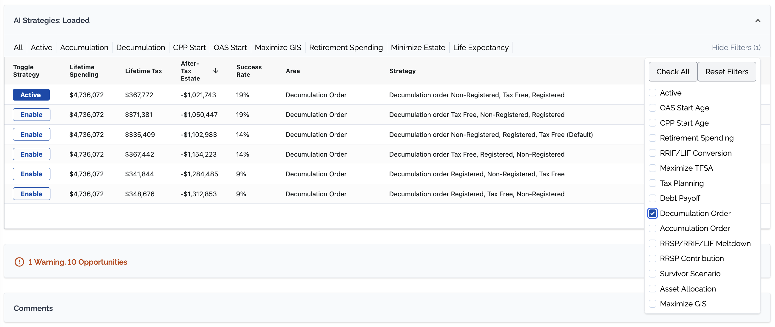 You can use AI Strategies to explore both accumulation order and decumulation order. Go to Planning > Projections > AI Strategy table and select the 'Select Filters' button. You can then scroll down to find the Decumulation Order strategies.