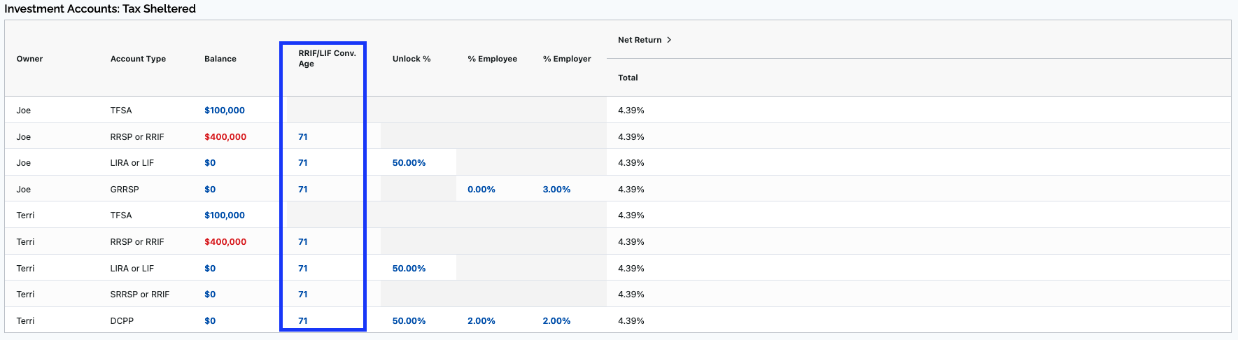 First, you'll want to check the RRSP/RRIF and LIRA/LIF conversion age in Planning > Projections > Advanced Options (top right of the planning table). Accounts like a LIRA or DCPP can only start withdrawals once converted to a LIF (which might be happening in your case if withdrawals only start at 72 currently).
