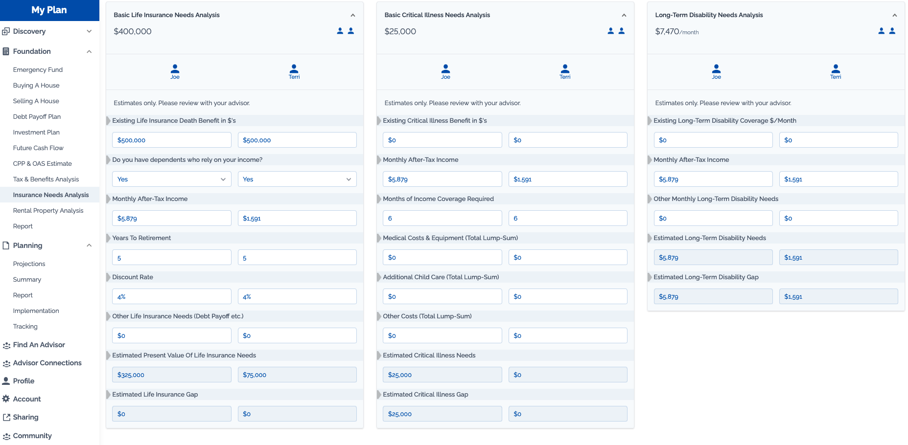 This section serves as a basic insurance needs analysis to help illustrate where they may be a gap in your current insurance coverage. This is only for educational purposes, please consult with your insurance advisor.