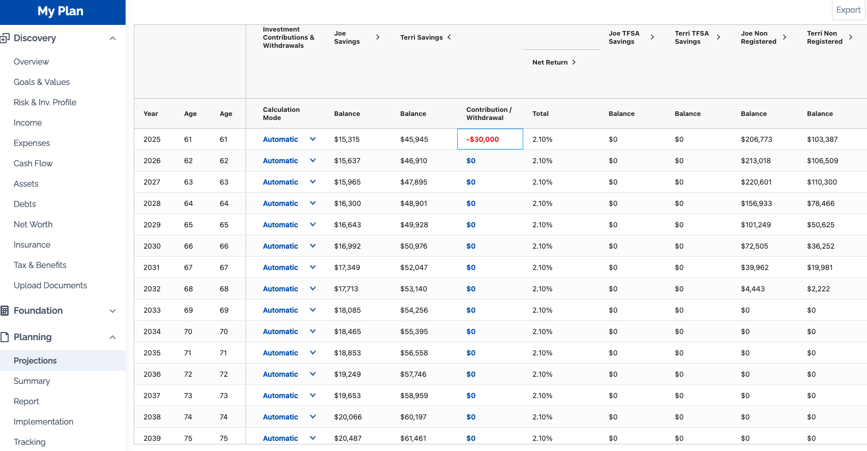 Then in Planning > Projections > Table you’ll plan a withdrawal from the Non-Reg Savings account using an override. Scroll to the right to find the Savings account, open the account using the “>” arrow. Then double click the $0 to add a -ve withdrawal override for the amount you plan to withdraw. The platform won’t calculate a capital gain on the Savings Account.