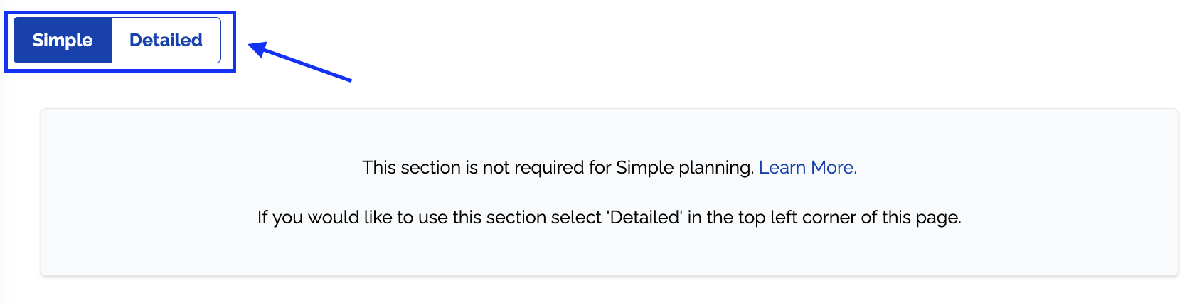 You can toggle between these modes in a section by clicking the 'Simple' or 'Detailed' button in the top left corner of the section.