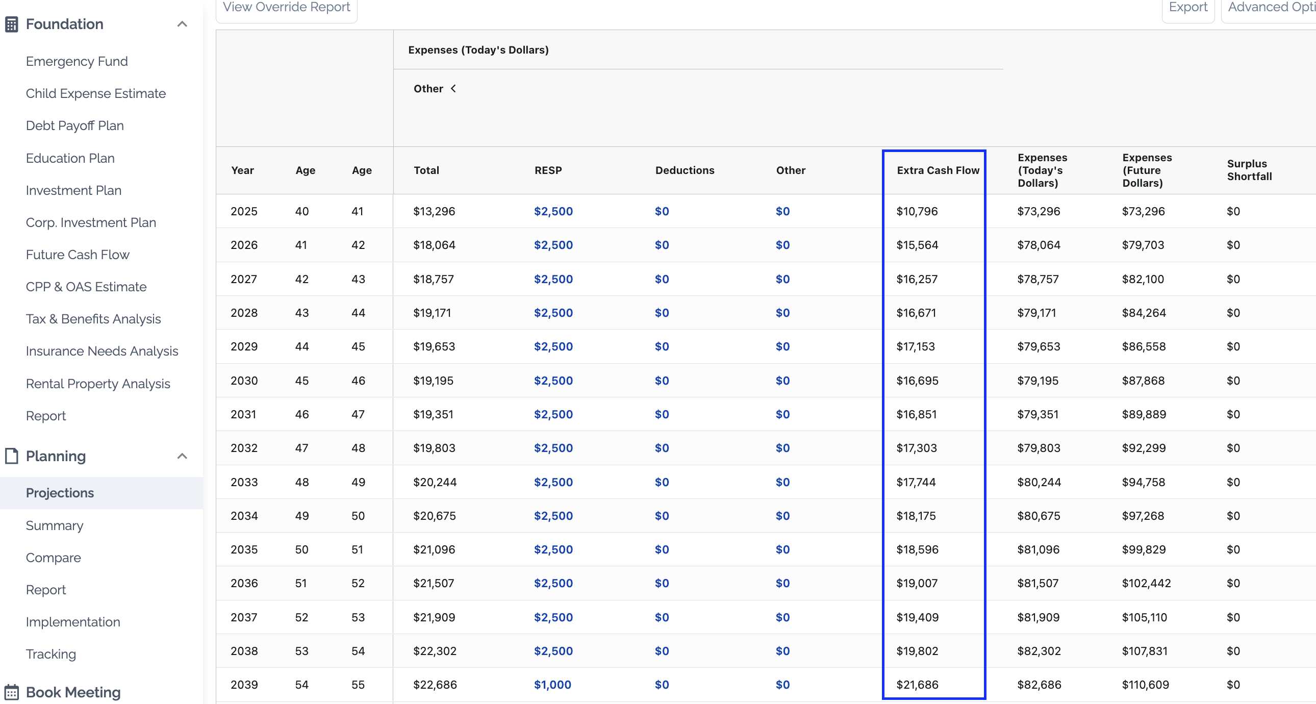 Pre-Retirement: the platform assumes that you save exactly as stated in the Expense Section. Once those savings and debt payments are met, it assumes the rest of your available income is spent. You can see that amount per year in Planning > Projections > Extra Cash Flow Column