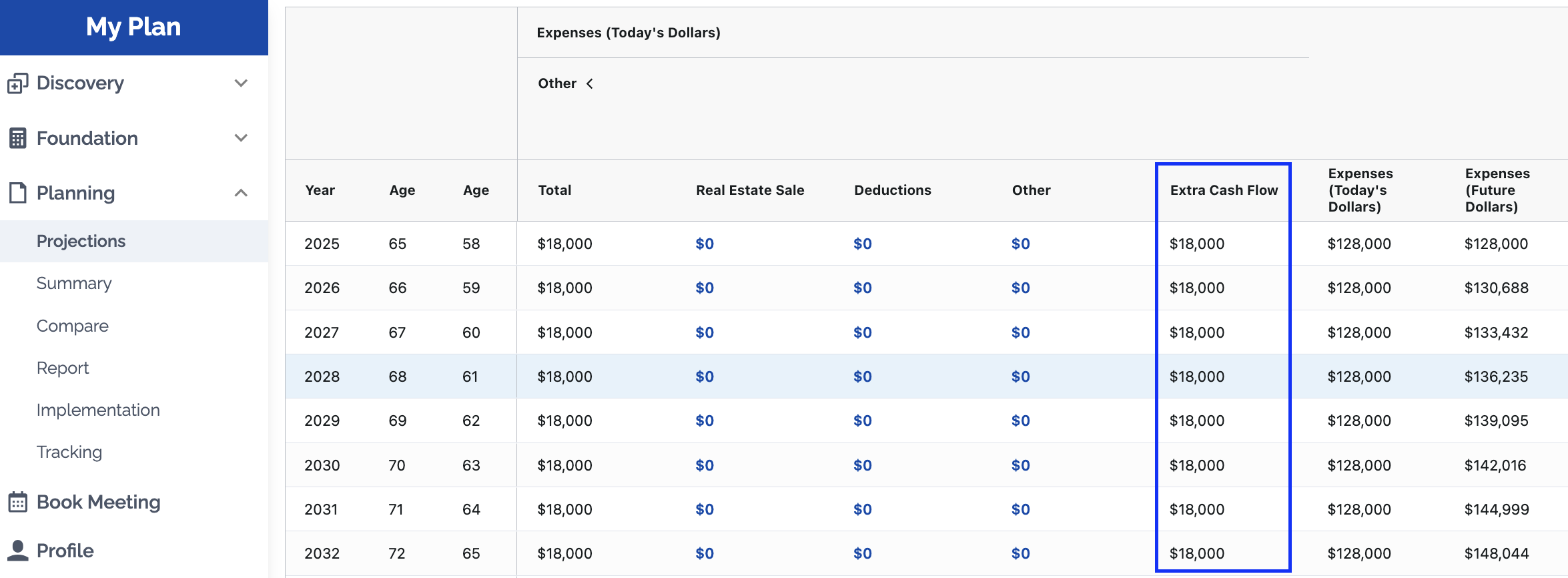 If you have enabled an AI Strategy for "Modify Retirement Spending" then the extra spending is put in that column. So if it is a round number like $30,000, $24,000, $18,000, $12,000, or $6,000 then it likely means you've activated an AI Strategy to increase spending (or if its negative then you've activated an AI Strategy to decrease spending).