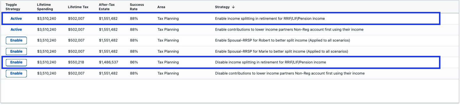 If you'd like, you can turn off income splitting to see the benefit it provides within your plan. Go to the AI Strategies and filter on "Tax Planning" you will see the option to disable income splitting.