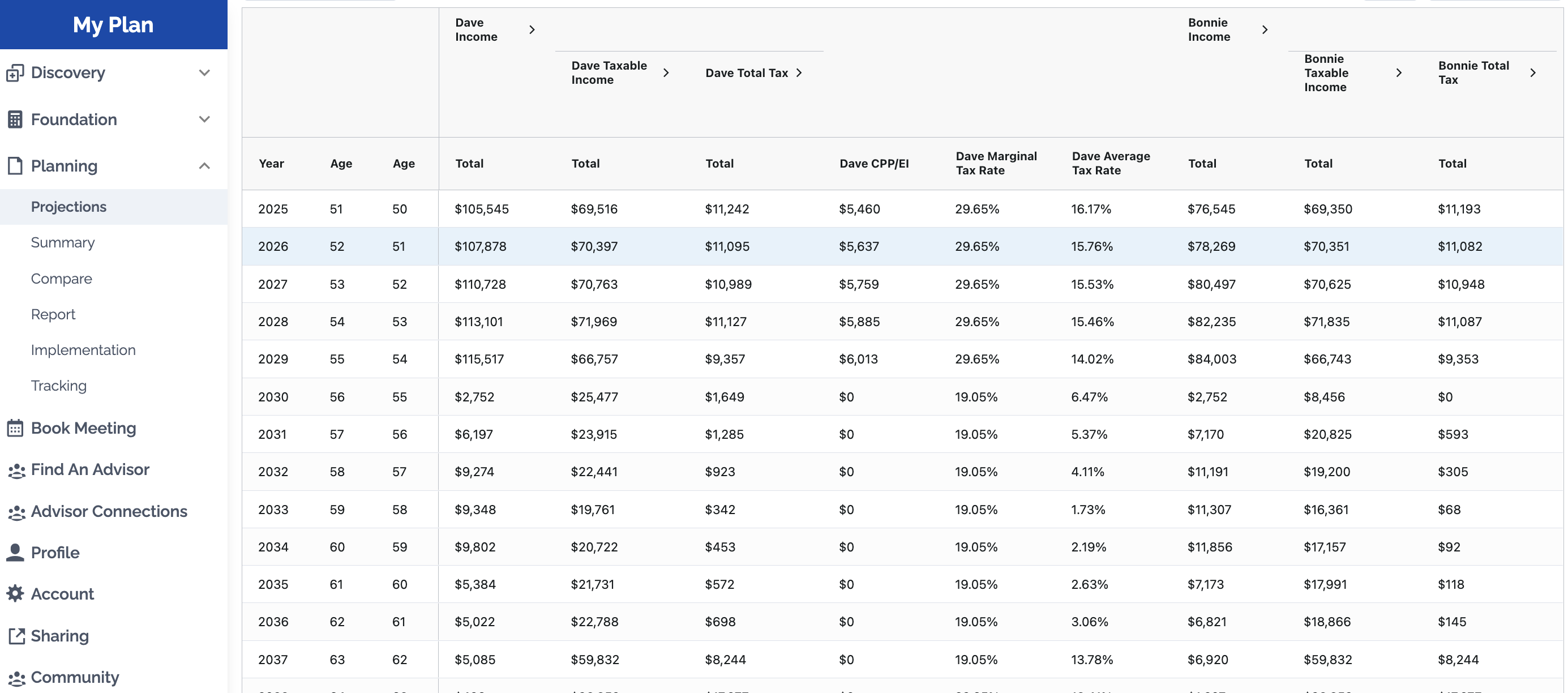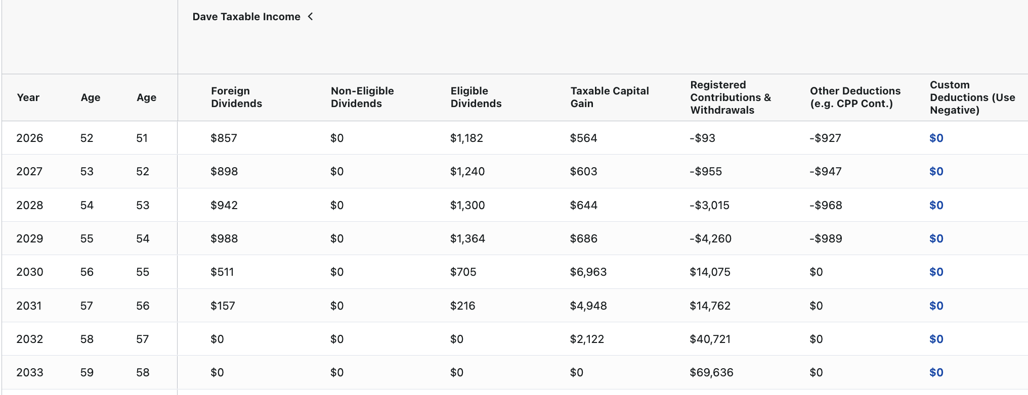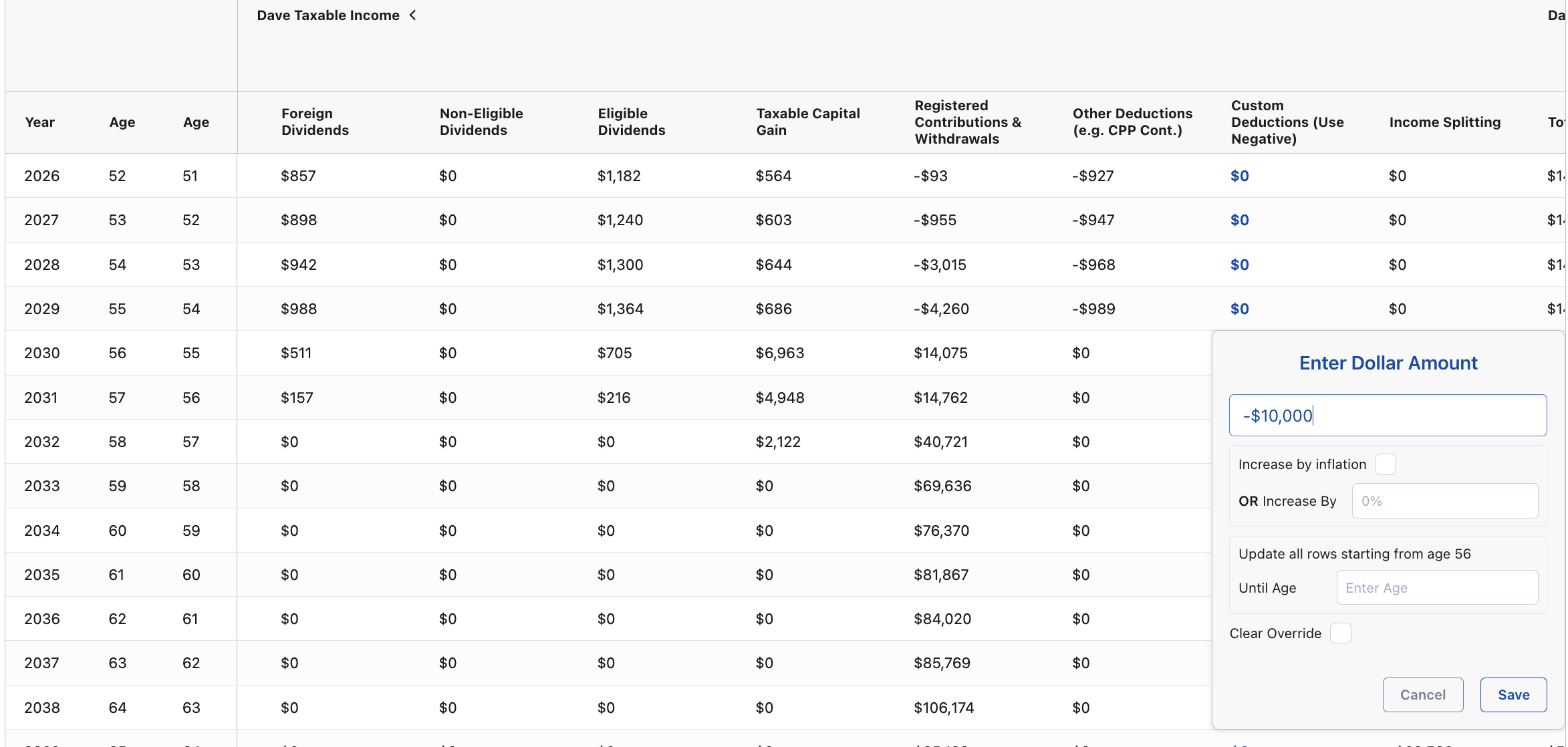 If you have a "carried forward" tax deduction from a previous year, such as an RRSP contribution you made but didn't claim or an FHSA deduction you're saving for a higher-income year, you can manually apply these to your plan using the Projection Table.